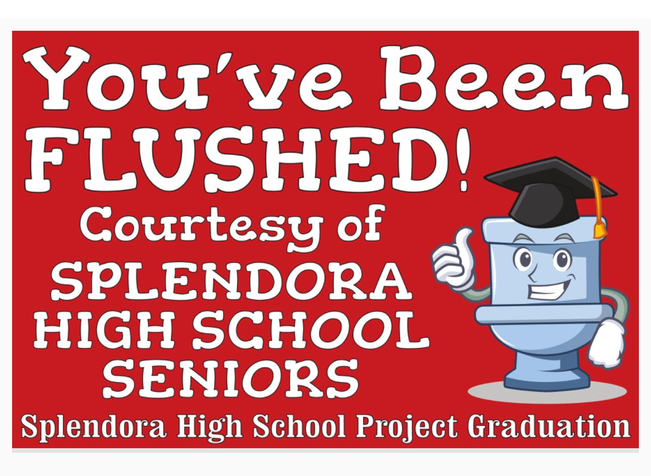 Flush your friends for a good cause. Fundraiser for Splendora Project Graduation. When Flushy shows up in your yard, you pay to remove him and you can pay a little more if you want to flush a friend. Must stay within the Splendora School District please. Price Ranges from $30-$50. Please choose view cart before checkout and enter delivery address in the special instructions box provided. email splendora.projectgrad@gmail.com with issues.